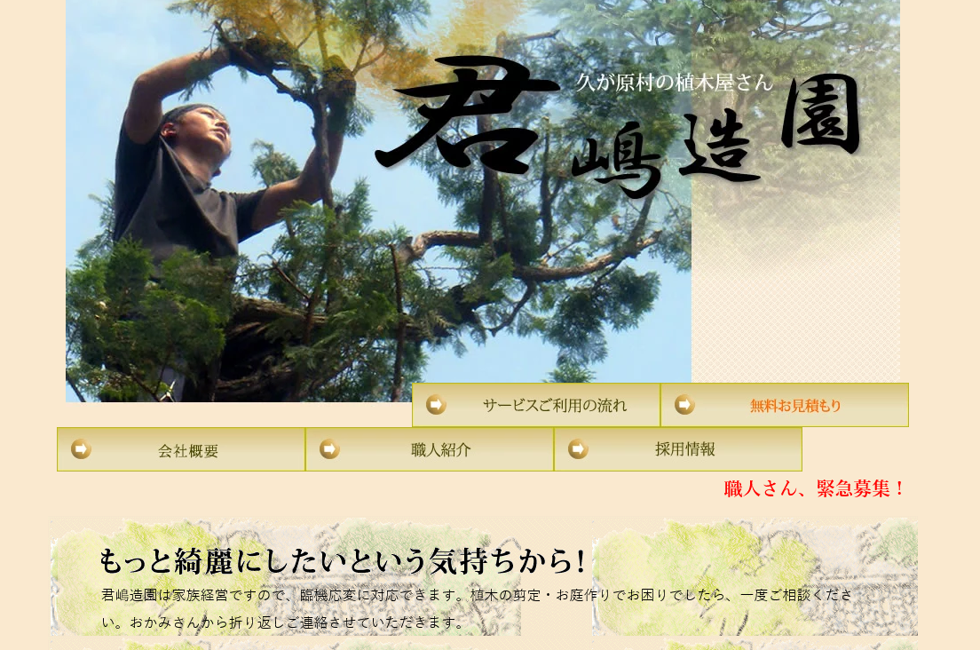 発注者は経営の大先輩、直江社長。家族で制作協力いただき、夕食を共にするなど、温かく迎えてくれました。このぬくもりが君嶋造園の社風につながっています。制作にあたり全権を委ねてくれたおかげで、スムーズかつ魅力的なサイトに仕上がりました。毎年、現場の写真がまとまると更新依頼をいただきます。剪定・草刈り・植栽・伐採・伐根など、そのときの仕事内容がページになり、グーグル対策になっています。論より証拠のコンテンツ制作が、息の長い運営のコツだと認識させてくれました。
