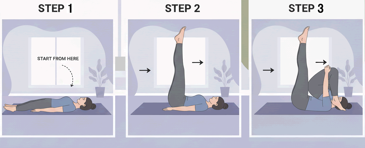 ステップ2: 背中を床につけたまま、足を垂直に上げる。