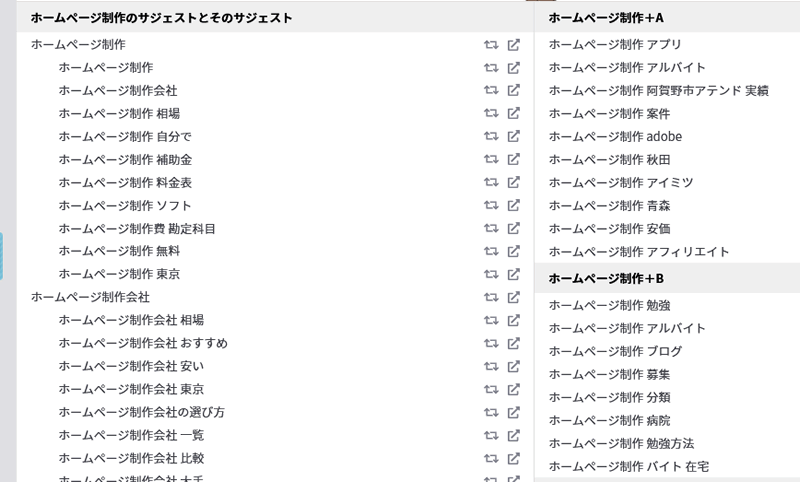 検索キーワード=ニーズなので、書く前にキーワードを決めておけば興味が保たれます。まずラッコキーワード(https://www.related-keywords.com)という優良なリサーチサイトがあるので、そちらを活用します。たとえば、弊社の第1キーワード「ホームページ制作」を入力すると、それに関連するキーワードが複数抽出されます。それをCSVダウンロードし、印刷して全体を見渡してください。それで自分と関連の深いキーワードに線を引いてください。
